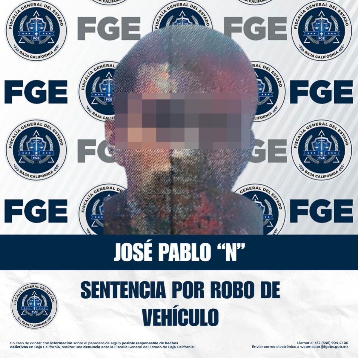 TIJUANA, B.C. A 26 DE ABRIL DEL 2026.— La Fiscalía Regional de Tijuana logró una sentencia condenatoria de dos años de prisión en contra de José Pablo “N”, tras ser hallado responsable del delito de uso de vehículo de motor robado. El juez de la causa negó cualquier beneficio libertario al hoy sentenciado, debido a que este ya contaba con antecedentes penales y una sentencia previa por delitos anteriores, lo que obliga a su permanencia en el centro de reinserción social.